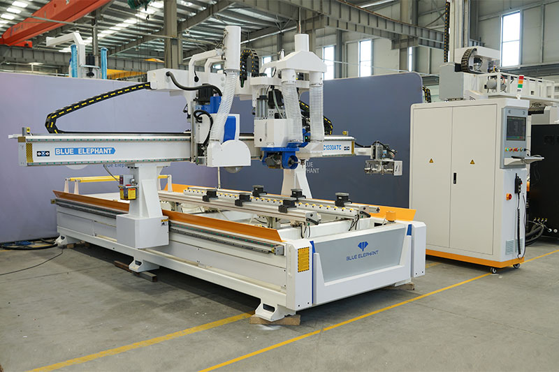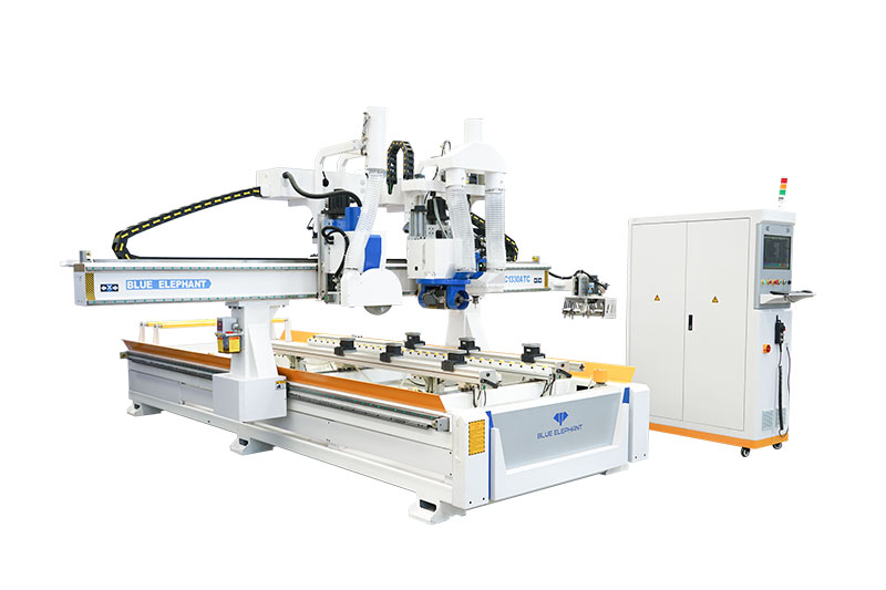 藍(lán)象多功能家具數(shù)控門加工中心是一款專門用于門邊切割、鉸鏈孔鉆孔、門鎖孔鉆孔的全自動木門加工機(jī),集傳統(tǒng)門鉸鏈孔機(jī)和四面切割鋸機(jī)功能于一體,大大提高了加工效率。 1、兩把鋸片均可90°旋轉(zhuǎn),完成木門方邊加工;