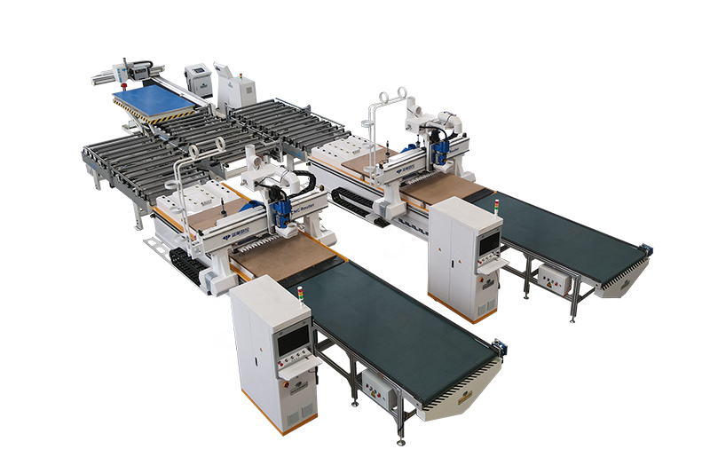 一拖二開料單元是一套自動化程度比較高的數(shù)控開料解決方案。開料單元由一臺高速自動貼標(biāo)機、兩臺全自動數(shù)控開料中心以及動力滾筒線、中控系統(tǒng)組成。人工只需將板材放置在升降機上,由貼標(biāo)機自動貼標(biāo),再由中控系統(tǒng)自動分配至開料中心,完成板材切割工作。如選配機器人系統(tǒng),可由機器人完成碼垛,余料利用及廢料輸出等工作。